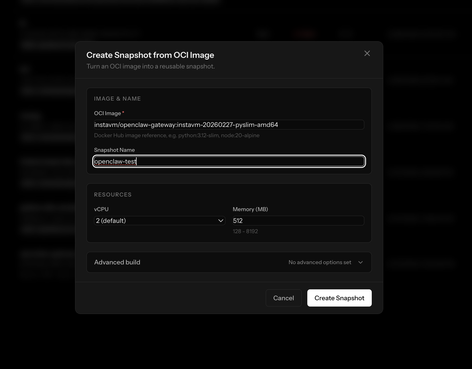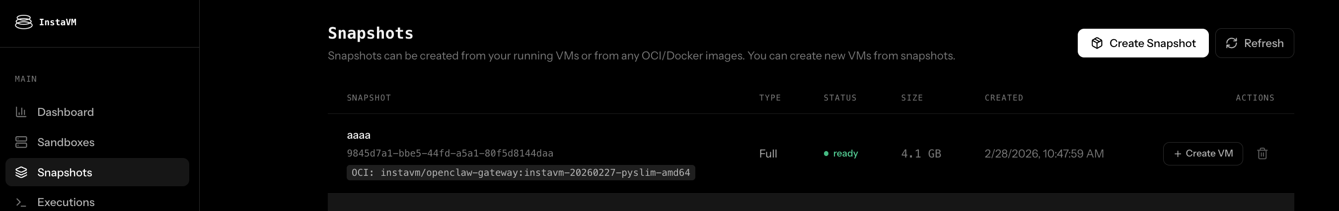 instavm/openclaw-gateway:instavm-20260227-pyslim-amd641) Create snapshot (Dashboard)